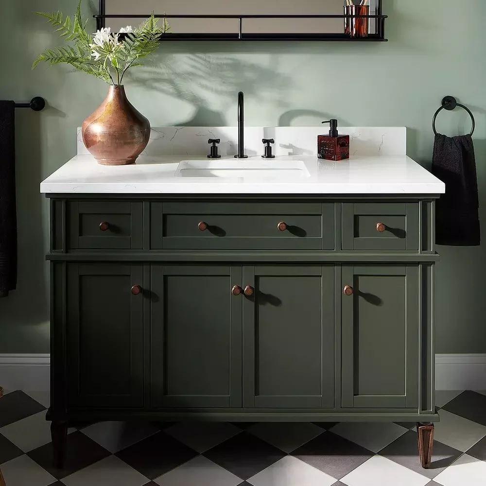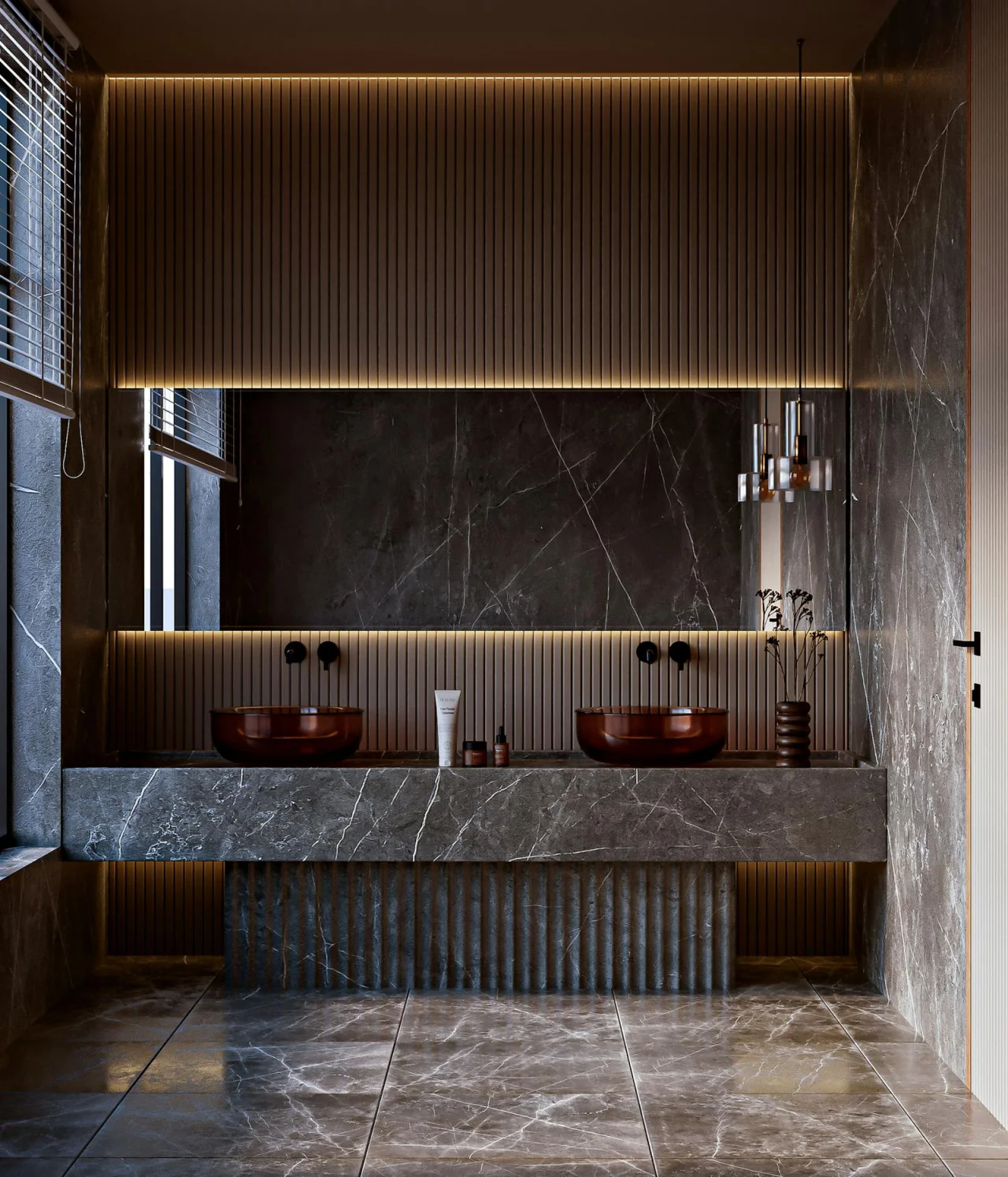 In 2025, vanities become the bathroom’s main design statement. Fluted textures, terrazzo finishes, and brass hardware turn functionality into art.